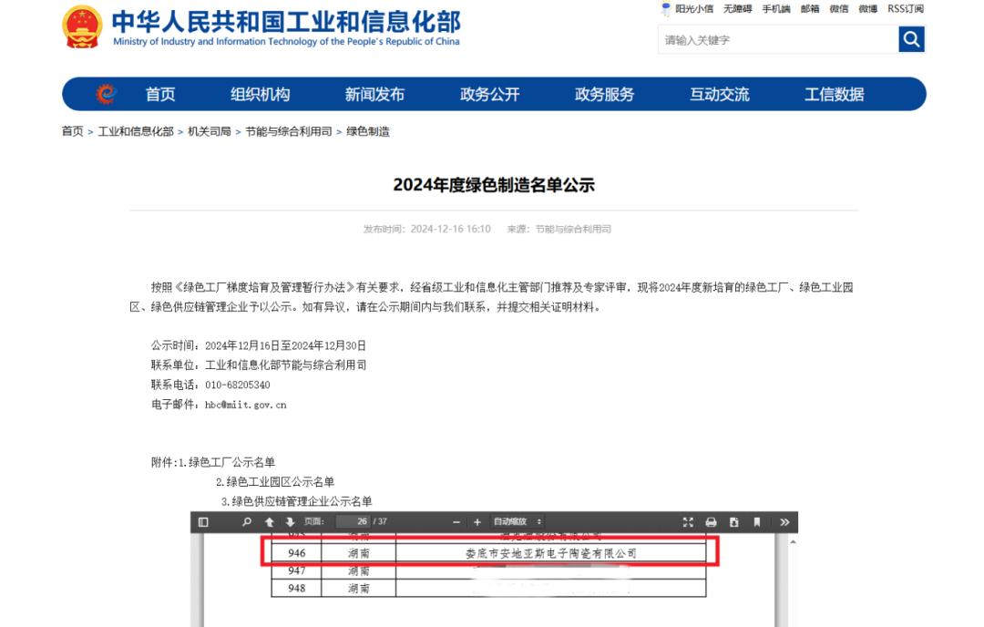 在可持續(xù)發(fā)展浪潮澎湃的當(dāng)下,工業(yè)領(lǐng)域的綠色轉(zhuǎn)型成為時代的必答題。近日,工業(yè)和信息化部公布了《2024年度綠色制造名單》,安地亞斯憑借在綠色制造領(lǐng)域的卓越表現(xiàn),榮獲“國家級綠色工廠”稱號,此榮譽是公司在綠色制造領(lǐng)域首創(chuàng)突破,更是為電子陶瓷行業(yè)樹立了新標桿。